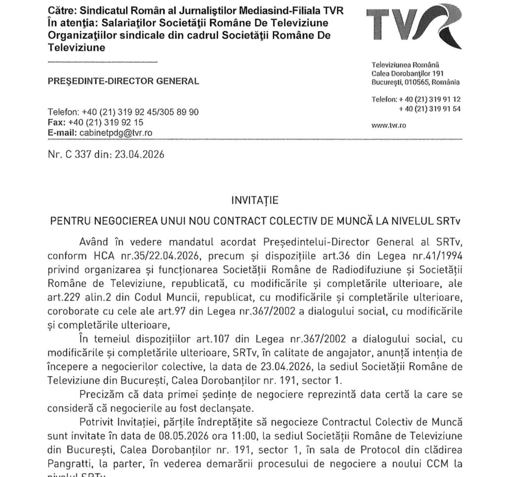 După o perioadă tensionată în care au existat îngrijorări reale privind salariile, locurile de muncă și viitorul instituției publice de presă, începerea negocierilor pentru noul CCM reprezintă un pas esențial pentru recâștigarea stabilității și a echilibrului TVR.