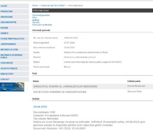 În data de 26 iunie 2023, SRJ MediaSind a acționat în instanță conducerea SRR pentru încălcarea Legii nr. 544/2001, după ce instituția a refuzat să ofere informații publice privind remunerațiile conducerii executive și ale Consiliului de Administrație. Prin sentința Tribunalului București din 15 martie 2024, SRR a fost obligată să furnizeze informațiile solicitate în termen de 30 de zile de la rămânerea definitivă a hotărârii. (amănunte aici:https://portal.just.ro/3/SitePages/Dosar.aspx?id_dosar=300000001078267&id_inst=3 ) În urma recursului, Curtea de Apel București a respins apelul SRR la 29 aprilie 2025, rămânând aceeași soluție de la fond. (amănunte aici: https://portal.just.ro/2/SitePages/Dosar.aspx?id_dosar=300000001078267&id_inst=2)