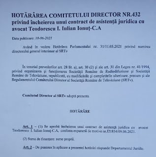 Onorariul stabilit pentru avocatul de casă al Ramonei Săseanu, este de 9 000 de lei/lunar la care se adaugă decontarea cheltuielilor reprezentate de combustibilul necesar deplasărilor pentru procesele aflate pe rolul instanțelor de judecată. Durata contractului a fost stabilită până la data de 31.12.2021 iar Hotârîrea CD a fost publicată pe rețeaua Intranet din TVR în data de 10.06.2021.(foto)